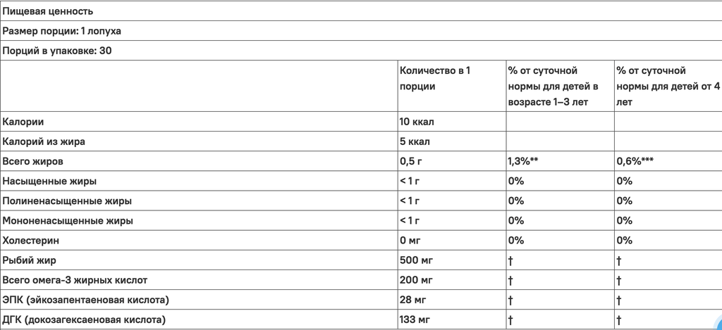 Каждая лопающаяся капсула содержит 500 мг натурального рыбьего жира